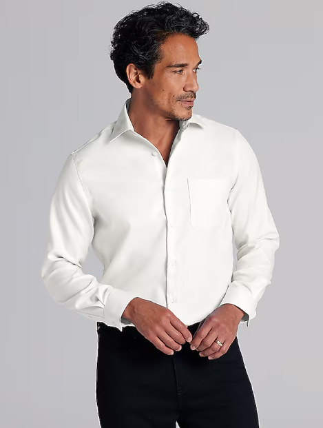 A properly fitting Pronto Uomo® shirt should allow two fingers between your neck and the collar, have shoulder seams that align with your actual shoulders, and sleeves that end at your wrist bone when arms are at rest.
